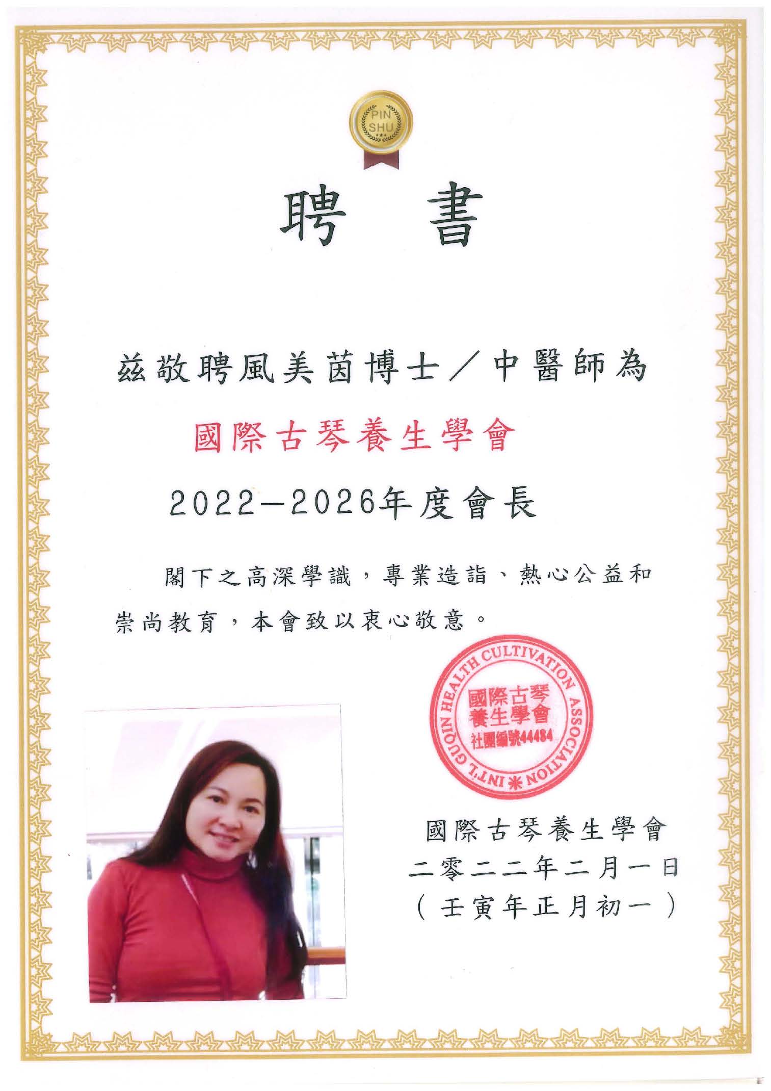 兹敬聘風美茵博士/中醫師為國際古琴養生學會會長